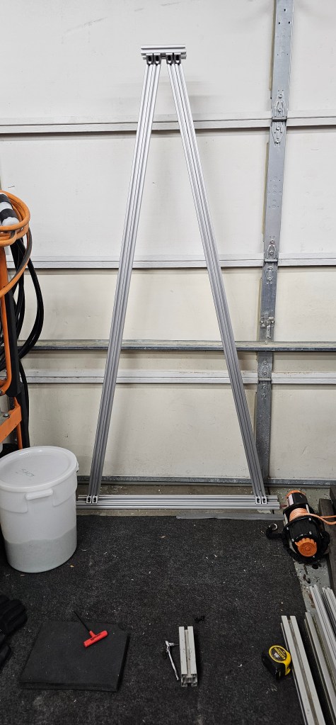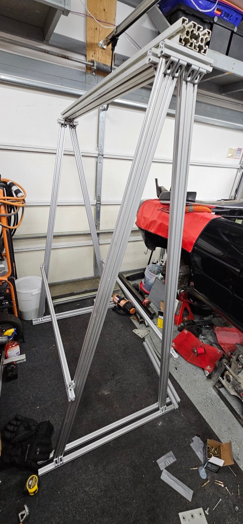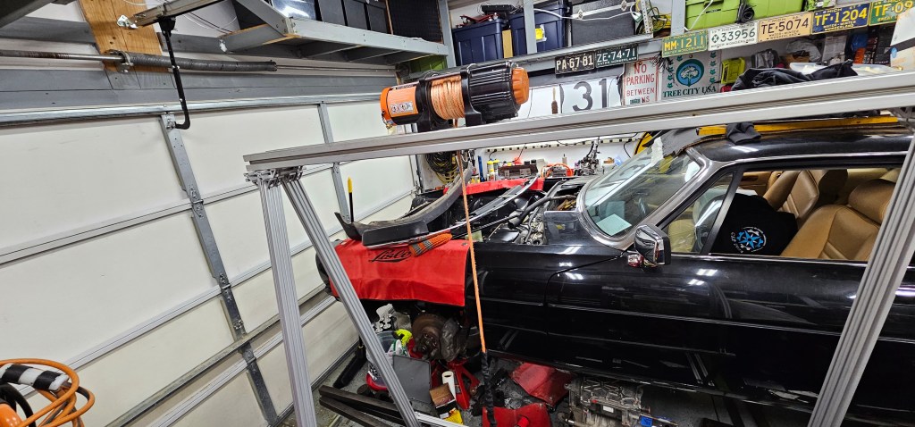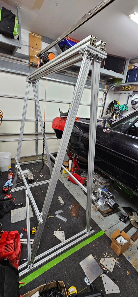 I needed a way to easily get the motor on and off of my floor jack, or in and out of the cradle. Because of limited space and a sloping driveway, a traditional engine hoist/cherry picker wouldn’t work well.