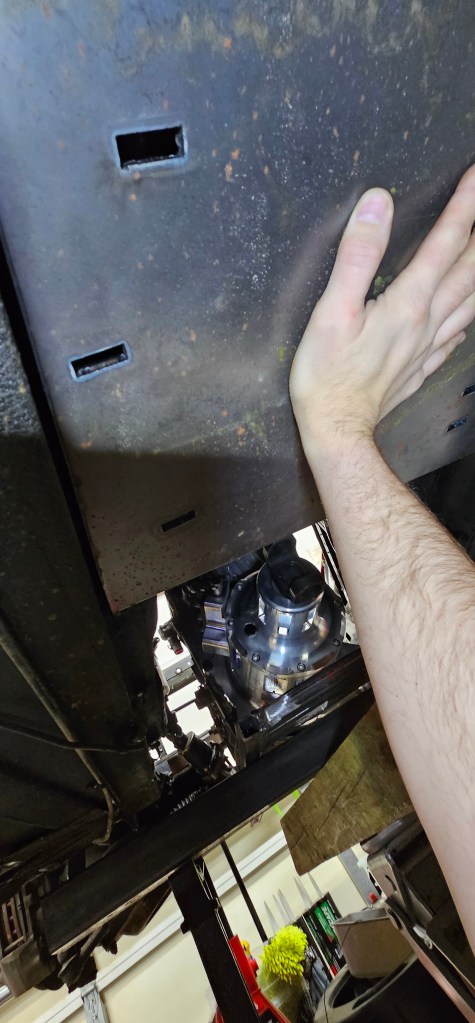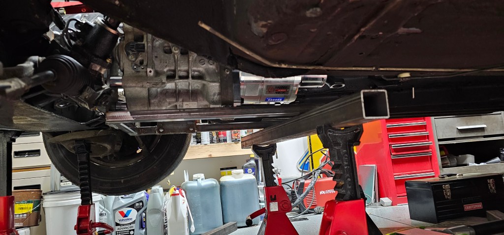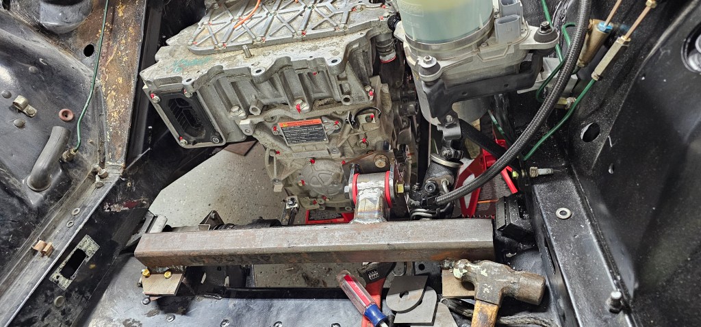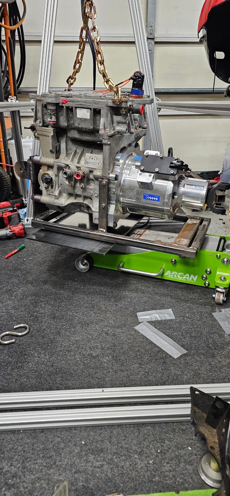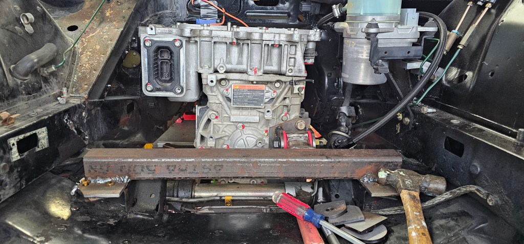 Once I had the motor assembly on the floor jack, I lifted it back into position and connected the front motor mount for the first official time.