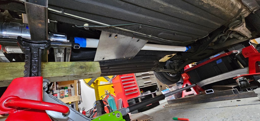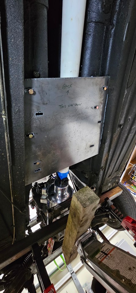 Now the next step is to make spacers for the plate that goes where the transmission was (to clear the driveshaft) and fabricate the trailing arms. The PVC driveshaft placeholder fits exactly as it should.