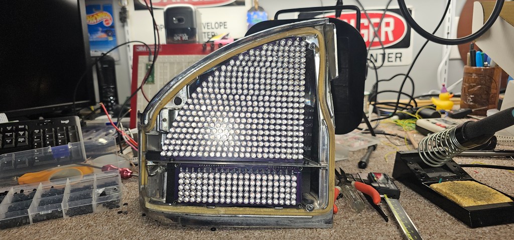First, I have the left taillight complete! I finished the LEDs for the brake part and in total each light assembly will have 460 LEDs.