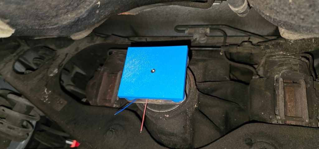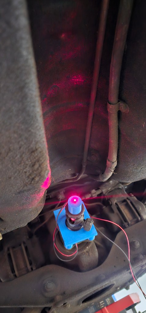 I decided that before I do anything else on this project, I need to get the motor mounted. To start, I need to see where the rear differential lines up with the front of the car. My idea is to use a laser mounted to a piece that snaps into the yoke of the rear diff, but this version proved that the laser did not shoot out straight.