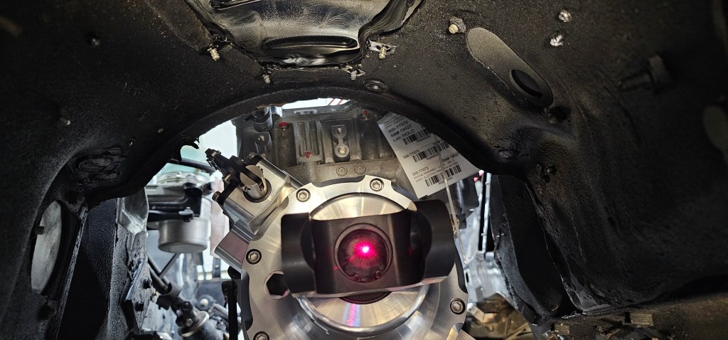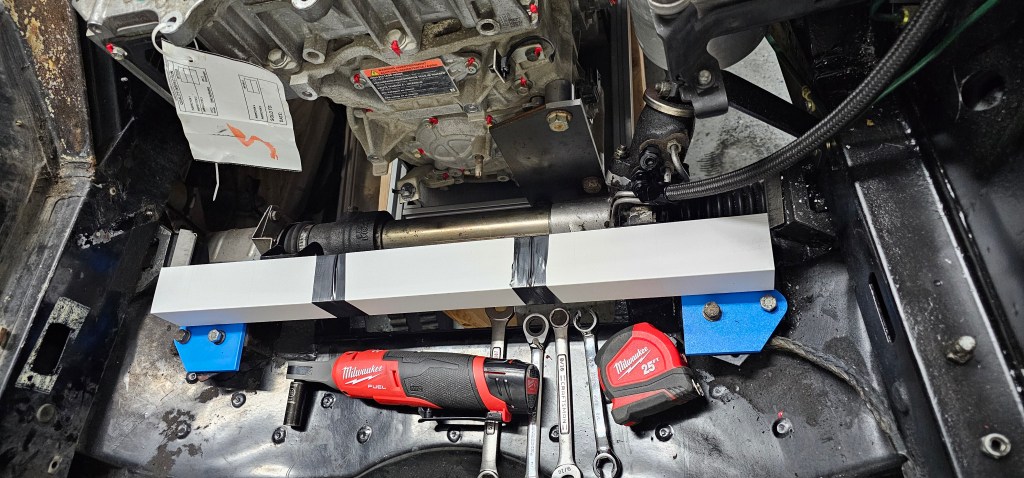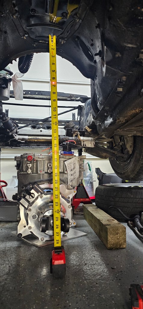 I slid the motor and TorqueBox under the car and measured about where the center of the yoke is and the laser dot from the rear diff. It looks like I can tuck this motor up tight under the transmission tunnel. It’ll be an interesting motor cradle when I’m done, but as long as it handles the torque, I’ll be happy.
