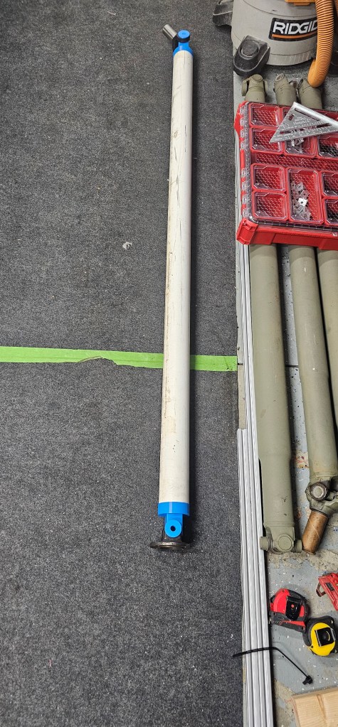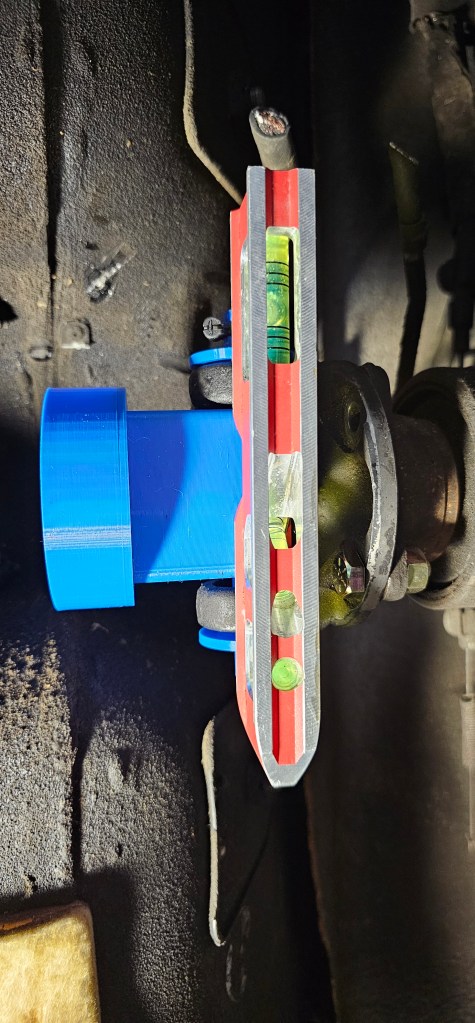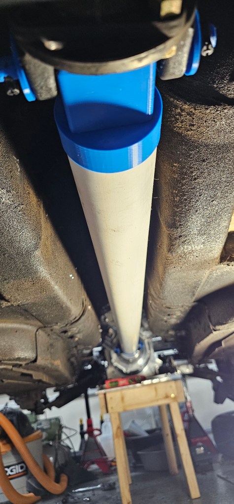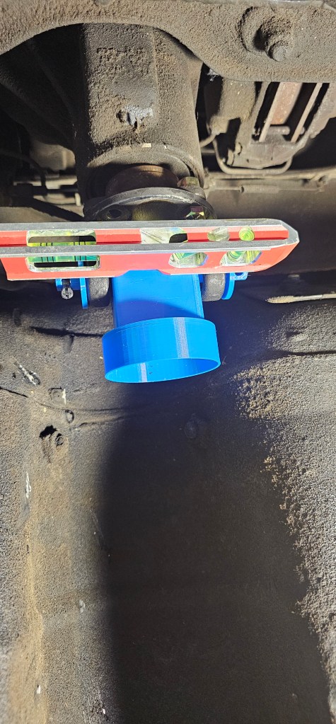 Over the last few days I made a temporary PVC driveshaft that fit into place perfectly. The angle of the diff and the motor are at zero degrees. The motor is offset slightly from center which allows clearance of the driveshaft and gives the ujoints some movement so they don’t freeze up.