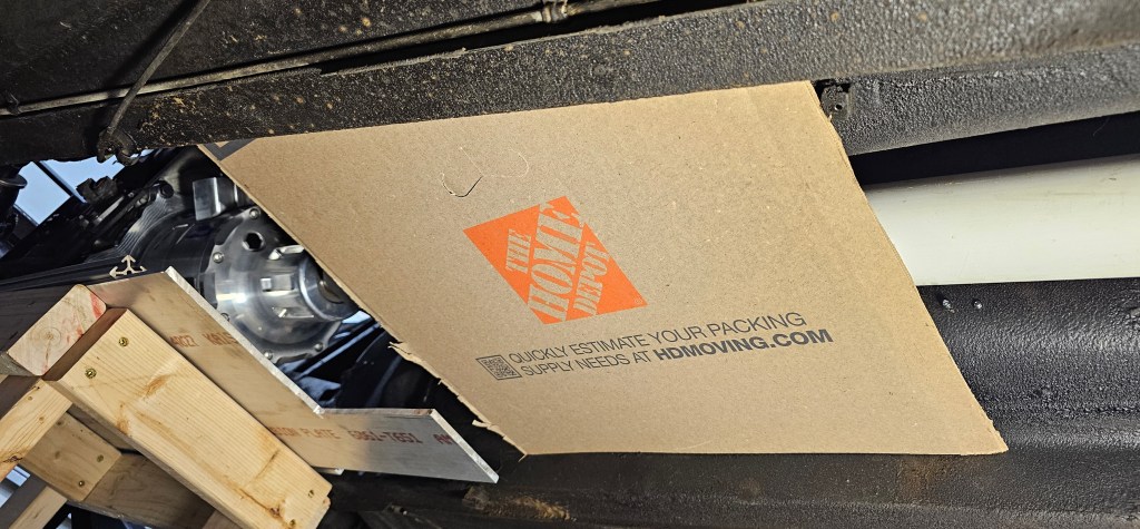 Lastly I started making a cardboard template to draft what the bottom plate of the car will look like. This plate will mount under the driveshaft where the original transmission support mounted. This will then have two trailing arms that will support the back of the motor/gearbox “bucket”