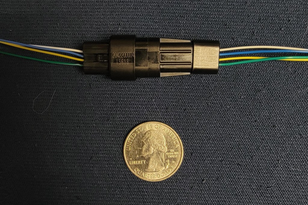 The Ampseal connectors I’m using elsewhere in the car will not fit in the small hole in which the wires have to pass, so I am using these Molex Squiba connectors. Actually, they are a little too small, but they did do the job.