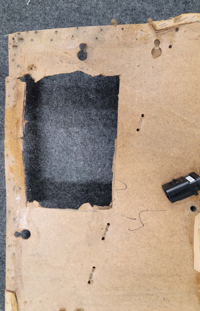 I kinda forgot that when I get new carpet for the car, I need to recarpet the bottom of the door pads. That gives me a chance to repair the big hole I cut 15 years ago, recarpet and install more suitable round speakers in their place.