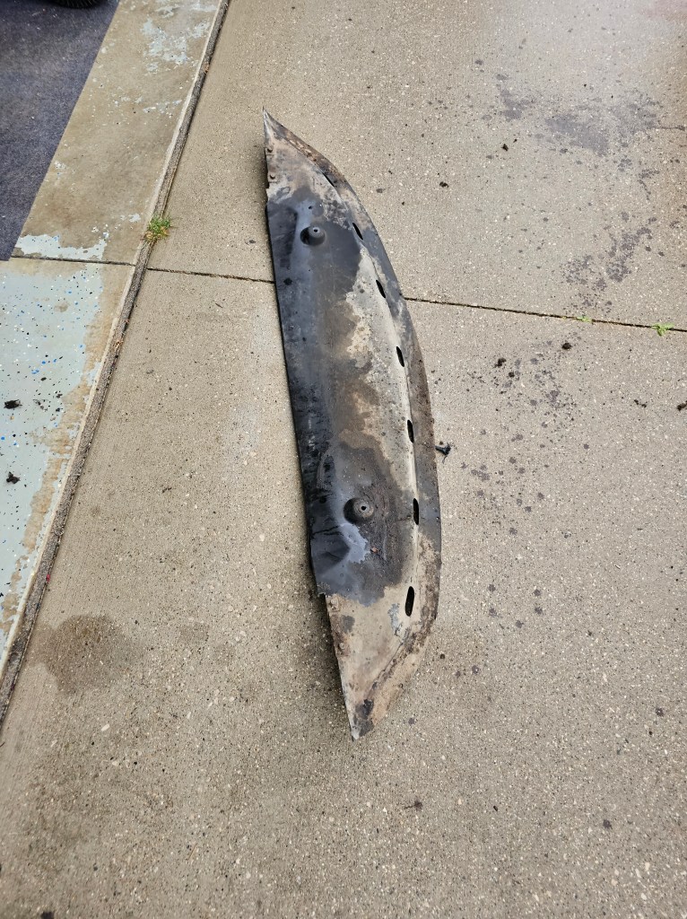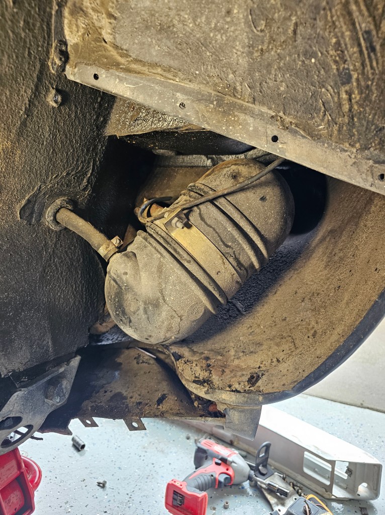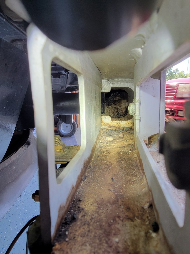 When we pulled the engine out I discovered there are frame-rail like boxings that go from the engine bay all the way back. Mice gross in there. I need to flush it out, but I need to expose some inspection plates to do so. In the process of figuring that out, I learned the bumper is hollow-ish and also if full of mouse gross.