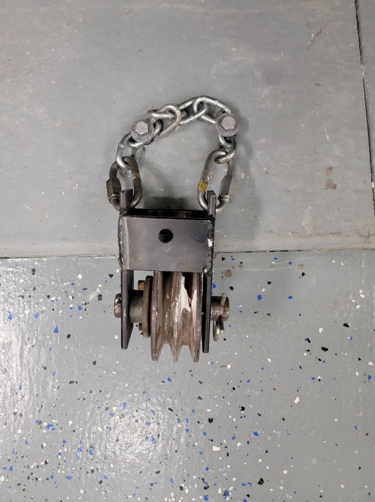 So, I bolted this block to the floor to loop the winch rope through and pull the car into the garage from the trailer.