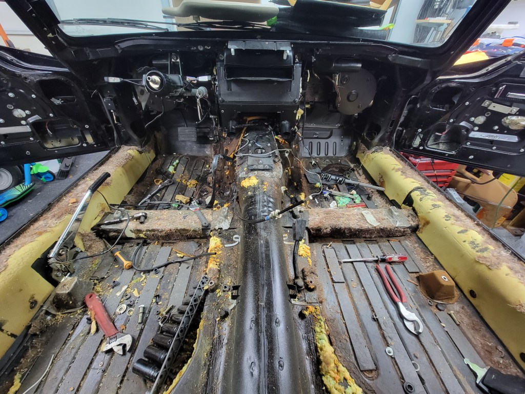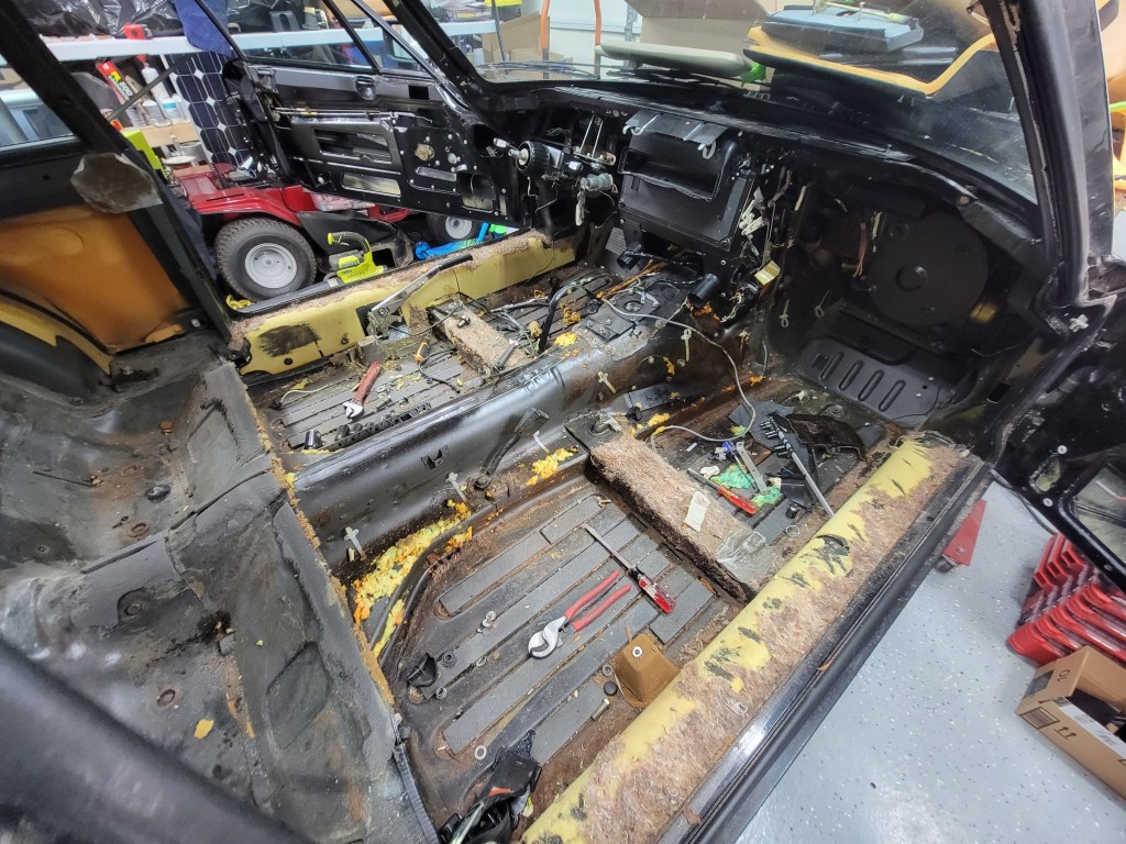 It’s time to pull coolant out of the car. I need to remove the heater core and I don’t have a good way to drain everything in the tight space I’m in. So, I decided to use an old garden hose and a small pump and suck all the coolant out of the engine. And it’s gross looking.