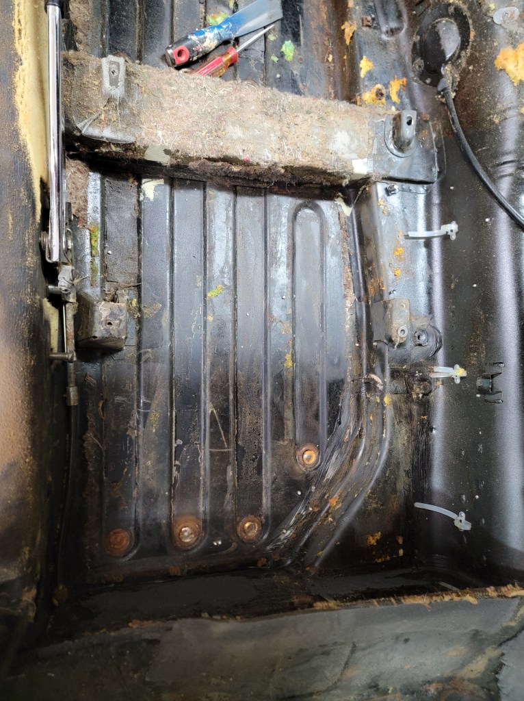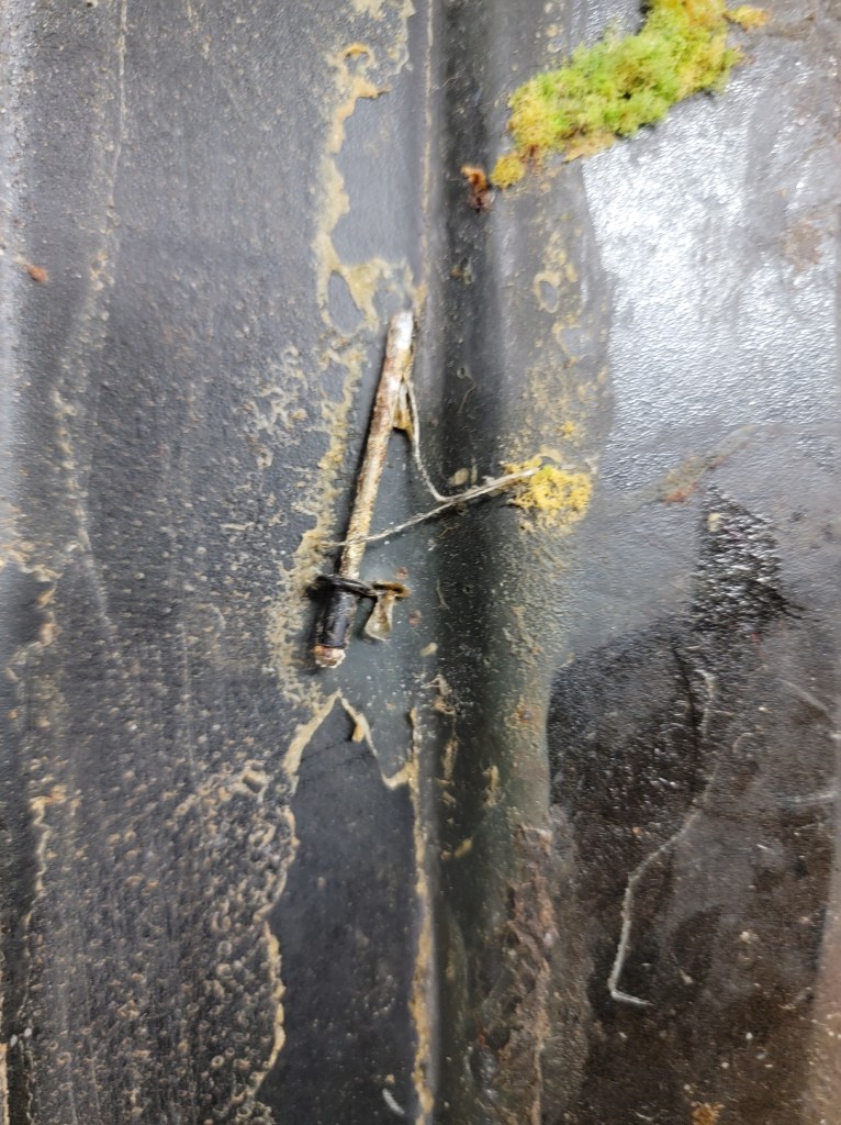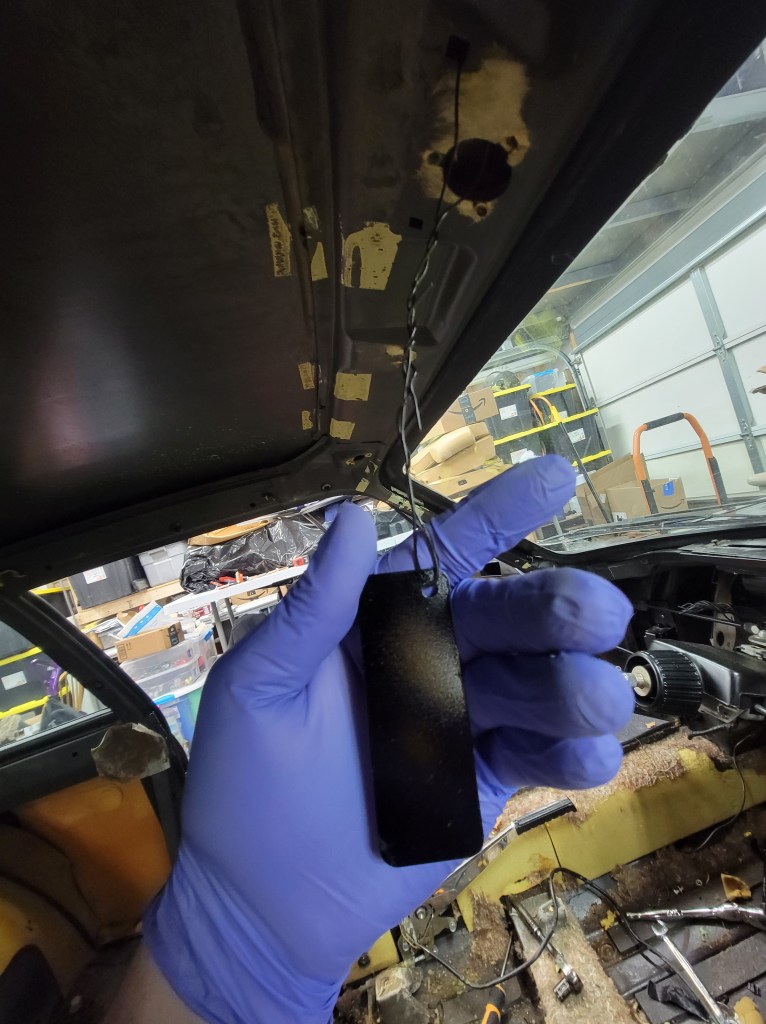 I found this under the headliner. I thought maybe it was a VIN tag – nope, just a random piece of metal half painted.