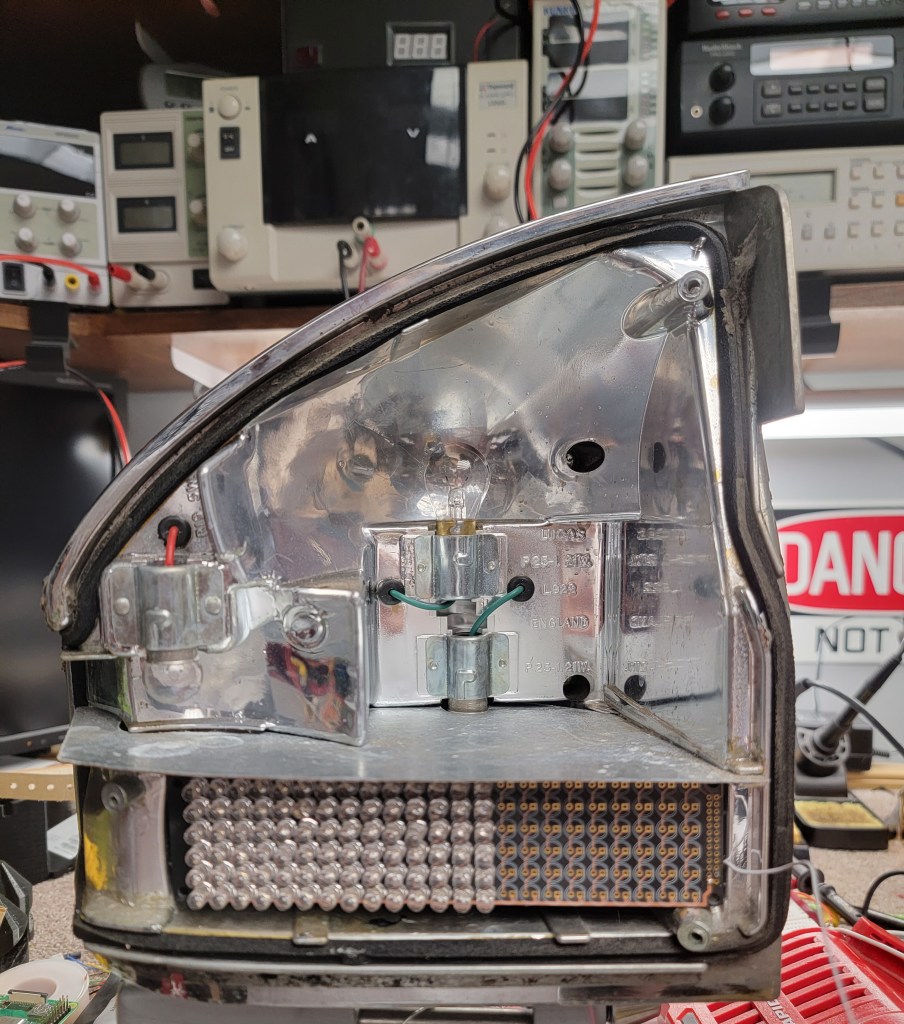 This is a spare taillight housing I got off eBay. I gutted it and designed a board in KiCad to hold the LEDs. In later posts I’ll have videos of it operating, but since I’m playing catch up on this blog, I’m trying to do things in somewhat of the order in which they occurred. In this case, the beginning of sequential tail light design.