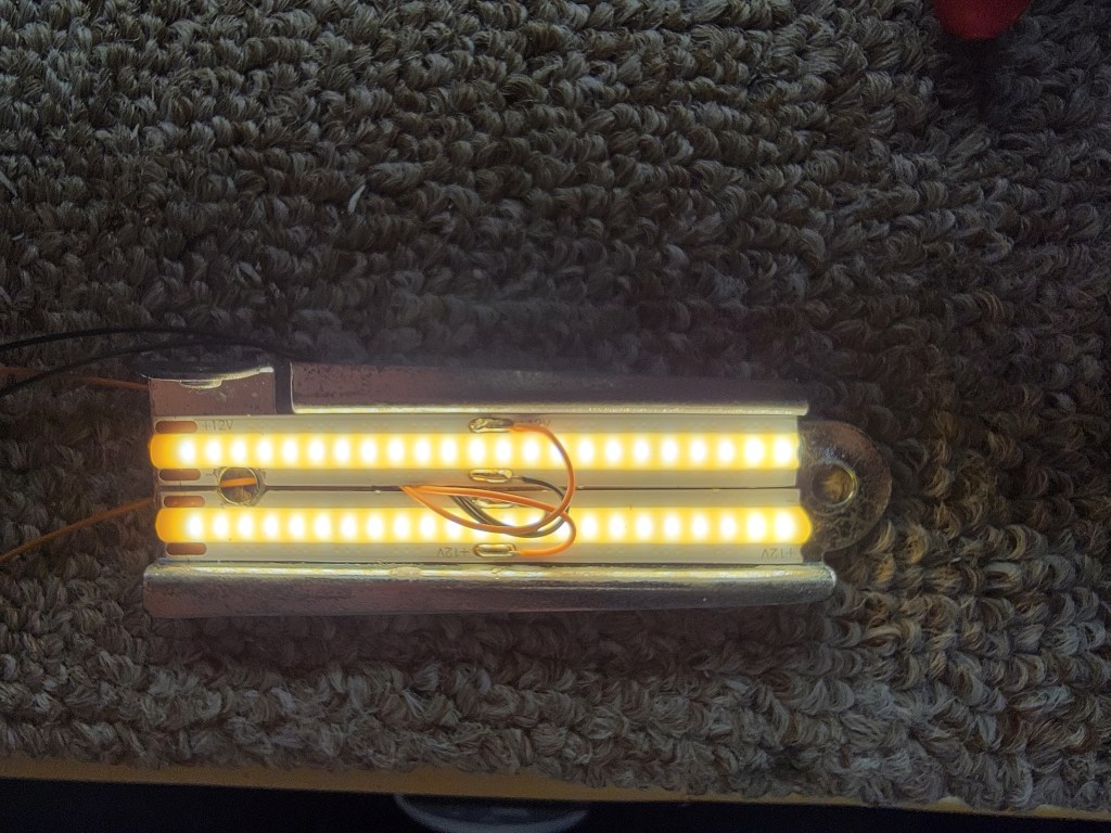 I’m using these small cobb LED strips. They have a high density of LEDs in a small strip. I did have to notch the strip a little to clear for the screw, but I made sure to notch on the negative side so if something shorts out, it’s just bonded more to ground.