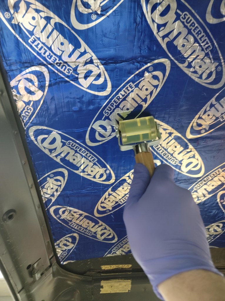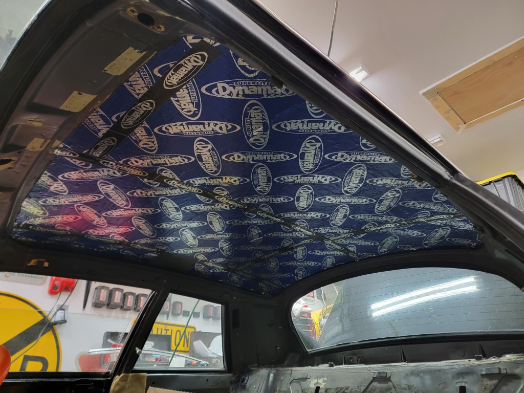 Last for today was to install some Dynamat on the roof of the car. This is the thin/light stuff which works great for a roof. I plan to Dynamat the floor, but I need to get the engine pulled and pressure wash everything first.